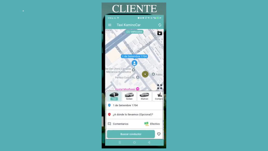 Un aplicativo disponible para Android o Iphone, por medio del cual el Cliente puede realizar pedidos de Taxi. El Cliente puede ver en tiempo real los taxistas mas cercanos a su posición. El Cliente puede ver los datos personales (foto, nombres, placa, unidad y color del vehiculo) del taxista que acepto el servicio de taxi. El Cliente puede ver en tiempo real como el Taxista llega a su posición. Otras funciones que ayudan en administrar los pedidos de taxis.