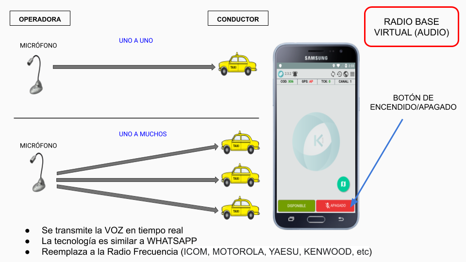 La Operadora puede comunicarse por Voz (en tiempo real) con todos los Conductores o con un único determinado Conductor. Migre la costosa Radio Frecuencia por una Radio Base Virtual de Comunicación. La voz se transmite por Internet (Red de Datos) de forma similar a la Tecnología utilizada por Whatsapp.